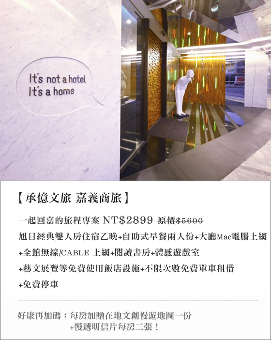 只要2,899元(雙人價)即可享有【承億文旅 嘉義商旅】原價5,600元一起回嘉的旅程專案:旭日經典雙人房住宿乙晚+自助式早餐兩人份+大廳Mac電腦上網+全館無線/CABLE 上網+閱讀書房+體感遊戲室+藝文展覽等免費使用飯店設施+不限次數免費單車租借+免費停車。好康再加碼:每房加贈在地文創慢遊地圖一份+慢遞明信片每房二張!
